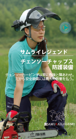 チェンソー作業時には着装が義務付けられたチェンソーチャップス。サムライレジェンドは10年来チャップスの販売を通じて安全装備の必要性を訴求して来ました。防護手袋、ベスト、イヤマフ、ヘルメットシステム等充実した装備を提供しています。